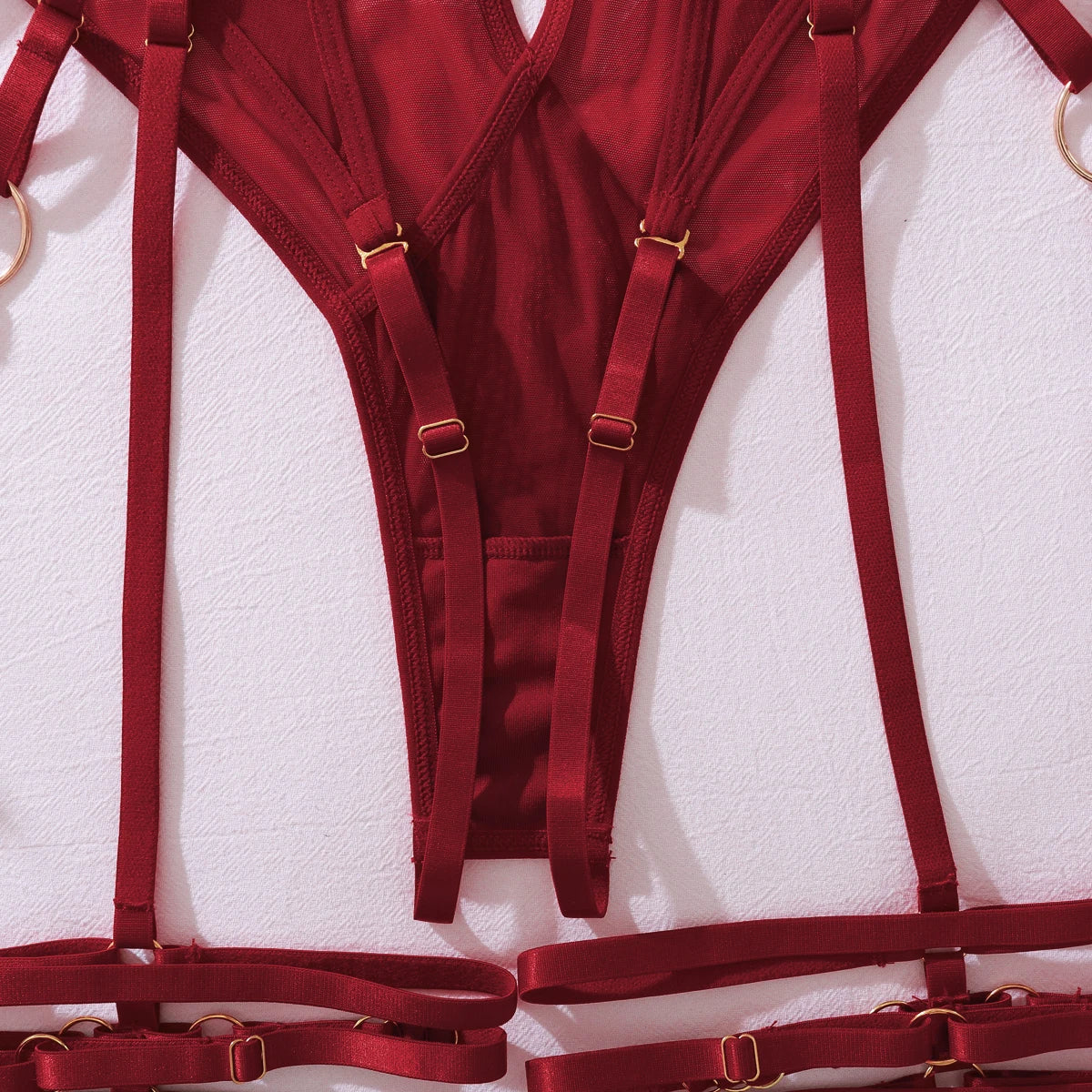This audacious 3-piece set is made for the bold, the playful, and the ones who love a little edge with their elegance. Featuring a deep-V hollow bodysuit, statement harness detailing, and a matching choker belt, this piece is all about commanding attention.